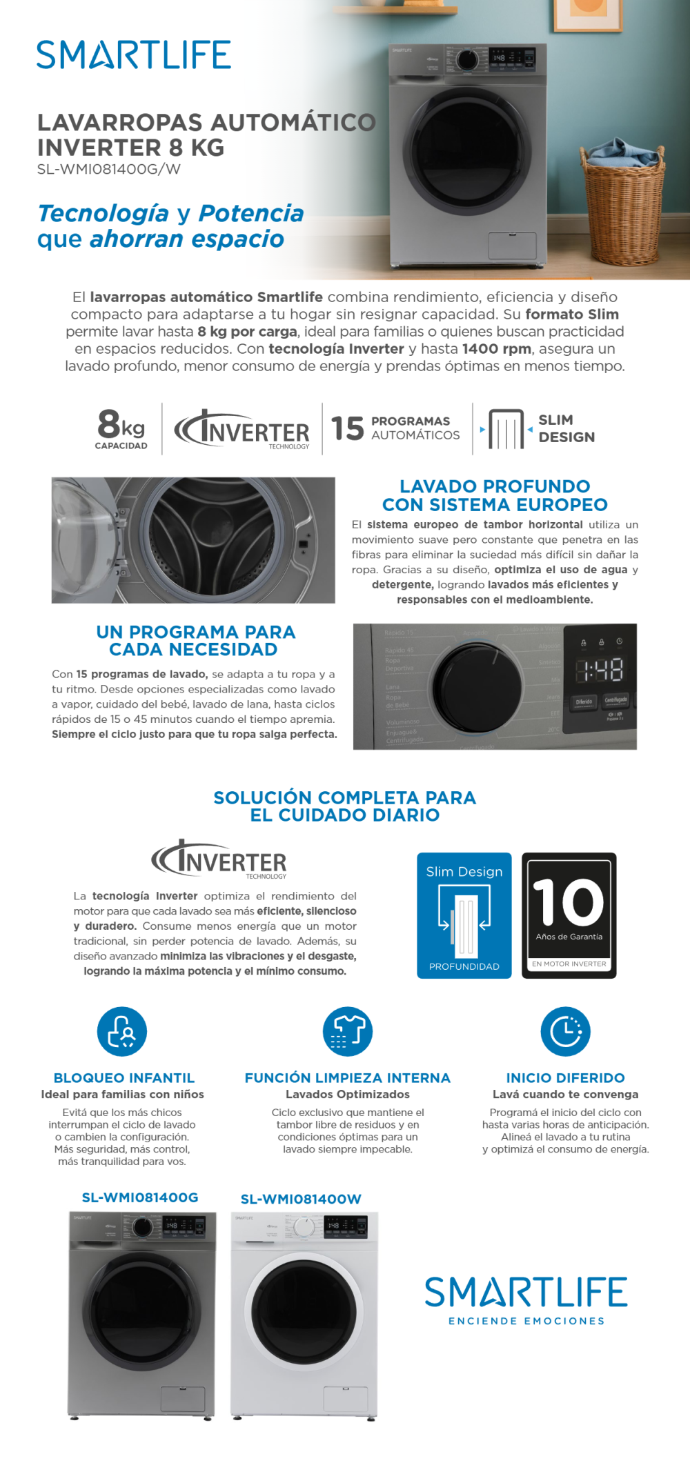 Lavarropa Carga Frontal Smartlife Inverter 8 Kg BLANCO 1400 Rpm Sl-wmi081400w