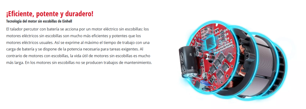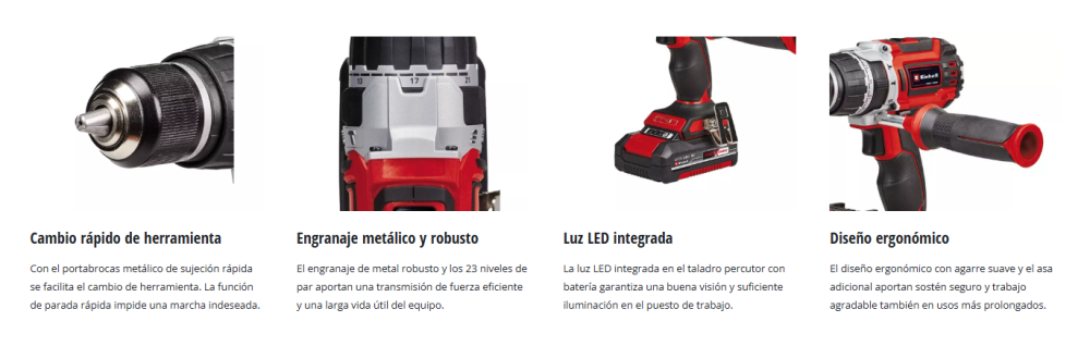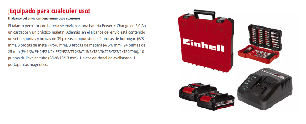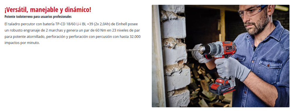 El taladro percutor atornillador inalámbrico TP-CD 18/60 Li-i BL +39 (2x2,0Ah) de Einhell es un aparato polivalente que destaca en tres importantes disciplinas dentro de los trabajos del hogar y taller: Un práctico dispositivo que combina a la vez las funciones de atornillar, taladrar y martillear con percusión. Un motor sin escobillas garantiza más potencia y un tiempo de funcionamiento más prolongado que un motor de escobillas de carbono convencional. La función de percusión conmutable permite perforar a altas velocidades también en materiales de mayor dureza, como ladrillo - para perforar en madera es suficiente la función simple de perforación. Mediante el ajuste de par y el engranaje de 2 marchas para potente atornillado y perforación rápida, el taladro percutor también proporciona menores velocidades para el atornillado en materiales más blando en caso de necesidad. El diseño ergonómico con agarre suave aporta una manipulación agradable también en proyectos exigentes, el agarre adicional da lugar a un trabajo que cuida las articulaciones. El taladro percutor dispone de un portabrocas de metal de gran calidad de 13mm. En la entrega se incluye un set de puntas y brocas de 39 piezas para el inicio inmediato del proyecto. La luz LED integrada confiere la visión completa al trabajar en zonas oscuras. Como miembro potente de la serie Power X-Change puede accionarse el taladro percutor con cada batería de la serie del sistema - a la inversa también pueden combinarse todas las baterías con todos los equipos del sistema. El envío se realiza inclusive 2 baterías PXC 2,0 Ah y equipo de carga rápida en el práctico maletín universal E-Box Basic.